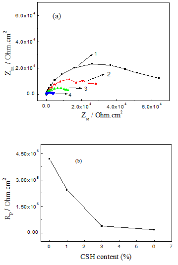 图3. 不同添加量的水化硅酸钙处理前后pH=12.5孔隙液中钢筋的(a)EIS图和(b)Rp值1-0%, 2-1%, 3-3%, 4-6%