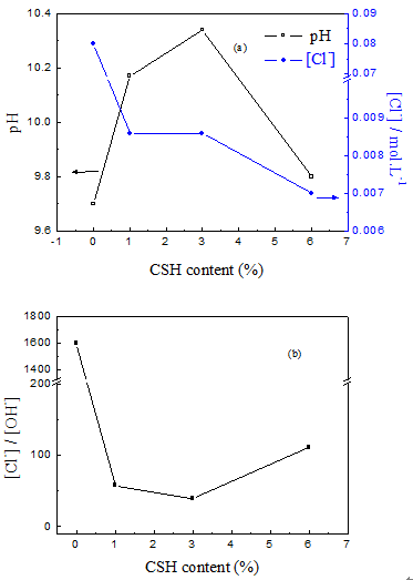 图6. 不同添加量的(1%、3%、6%)水化硅酸钙对pH=9.7孔隙液的影响. (a) pH值和[Cl-],(b) [Cl-] / [OH-]
