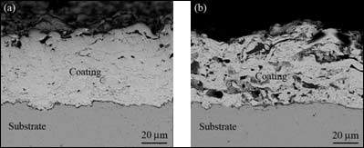 采用Nicon-300型立式金相显微镜和TCI金相图像分析系统软件,以灰度法测定孔隙率。涂层显微硬度测量在Leica VMHT 30M型显微硬度计上进行,测量时施加的载荷为50 g,持续时间15秒。