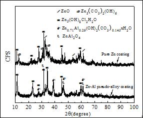 图4为纯锌和锌铝伪合金涂层盐雾实验768 h后腐蚀产物的XRD图谱。从图中可以看出,纯锌涂层表面生成的腐蚀产物主要为羟基氯化锌(Zn5(OH)8Cl2H2O)、氧化锌(ZnO)及碱式碳酸盐(Zn5(CO3)2(OH)6),这些腐蚀产物微溶于水,使得涂层的耐蚀性能降低;锌铝伪合金涂层表面除生成羟基氯化锌外,还有碱式碳酸盐化合物(Zn0.71Al0.29(OH)2(CO3)0.145∙xH2O)及尖晶石结构的氧化物(ZnAl2O4),在涂层表面形成致密的保护层,有效地封闭涂层中的孔隙,切断腐蚀介质渗透到基体,进一步提高涂层的耐蚀性。