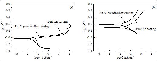 (3)动电位极化测试结果说明,锌铝伪合金涂层可以为基体提供良好的阴极保护,其腐蚀电流密度小于纯锌涂层,表现出更优越的防腐蚀性能。