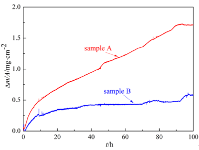 图3为Fe-13Cr-5Ni合金的两类样品在700 ℃的等温氧化动力学曲线。氧化前含有逆变奥氏体的样品B的氧化速率明显低于具有全马氏体组织的样品A。两类样品的氧化过程均近似遵循抛物线定律,(Δm/A)2=2kpt,其中Δm/A为样品单位面积氧化增重,kp为抛物线速率常数,t为氧化时间。经拟合计算,样品A和B的抛物线速率常数分别为1.36×10-2 mg2cm-4h-1和1.67×10-3 mg2cm-4h-1。由此可见,氧化前预先存在的逆变奥氏体可将氧化速率降低一个数量级。与马氏体单相组织相比,逆变奥氏体的存在明显提高了Fe-13Cr-5Ni合金的高温抗氧化性能。#p#副标题#e#