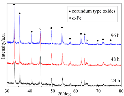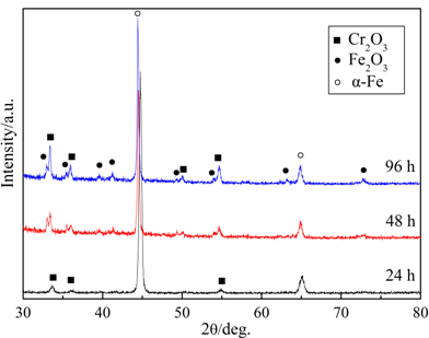 图6为样品A等温氧化24、48、96 h后的XRD图谱。α-Fe峰的存在表明氧化膜足够薄,X射线可以穿透并进入合金基体。由于Fe2O3和Cr2O3的峰位非常接近且容易重峰,分辨比较困难,因此标定氧化物为M2O3(M=Fe或Cr)刚玉型结构。