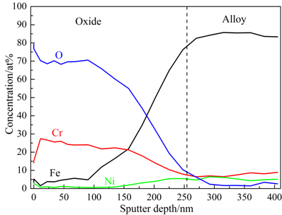 采用俄歇电子能谱(AES),对样品B氧化24 h后相对较薄区域沿深度方向的元素分布进行分析,溅射速度为45 nm/min(相对于SiO2),将溅射时间转换为深度,得到深度分布曲线,结果如图9所示。氧化膜由Cr2O3构成,膜与基体界面处存在非常明显的贫Cr区,Cr含量在7 wt%左右,远低于合金中平均含量(12.9 wt%)。样品B氧化24 h后相对较厚区域沿深度方向的元素分布与薄区类似,在此就不重复列出了。#p#副标题#e#