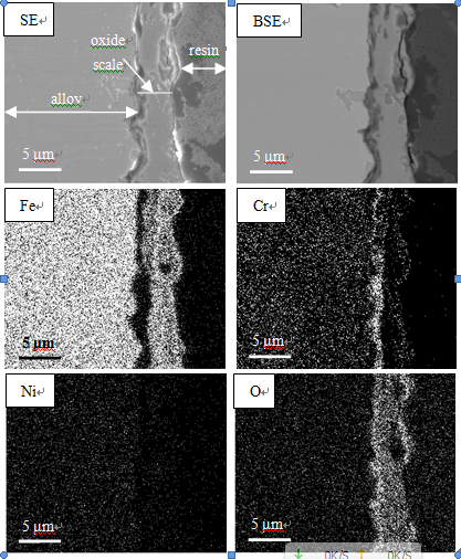 图11. 样品B氧化96 h后的截面形貌及元素面分布图