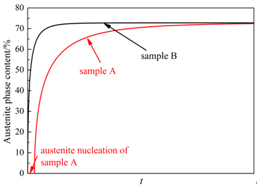 图13. 样品A 和B在700 ℃奥氏体相含量随时间变化的示意图