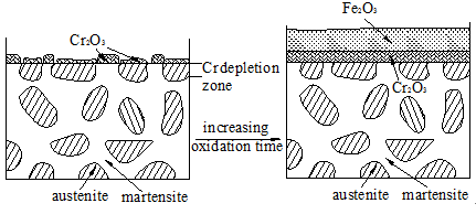 随着氧化时间的增长,合金元素在马氏体和奥氏体两相中分配,奥氏体相因此而富Ni,而马氏体相中Cr含量提高从而逐渐与奥氏体相的氧化速度保持一致,因此不均匀氧化的现象逐渐消失。总结上述讨论提出本研究中样品B的氧化过程模型如图14所示。