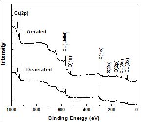 Figure 1. XPS spectra of DT-covered copper prepared in the aerated and deaerated aqueous micellar solution