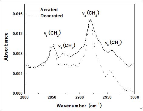 Figure 3. ATR-FTIR spectra of DT-covered copper assembled in the aerated and deaerated aqueous micellar solution