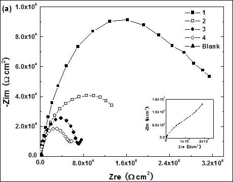 Table 1. Impedance parameters of bare copper electrode and DT-covered (samples 1 to 4) copper electrodes in 3% NaCl solution