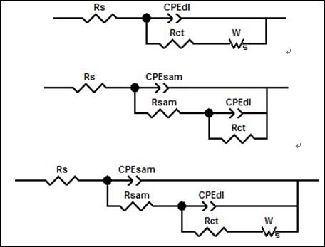 EIS结果的模拟等效电路如图5所示,其中Rs为工作电极和参比电极之间的溶液电阻,Rct代表电荷传递电阻,Rsam是SAMs的传递电阻,而W代表着Warburg阻抗。即使是十分致密的膜层,电荷仍然可以侵入[17],因此自组装膜不能作为理想的电容。采用常相位角元件(CPE)代替Cdl来更有效地模拟压扁的半圆形[18]。CPEsam和CPEdl分别代表自组装膜电容和双电层电容。CPE的导纳和阻抗用以下公式表示