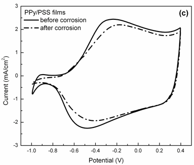 聚吡咯膜中掺杂阴离子的尺寸越大,阴离子交换性越差,亲核的OH-难以与聚吡咯膜中的掺杂阴离子发生交换而侵入膜结构内部,聚吡咯抗腐蚀的性能越好,即使在碱性水溶液中浸泡后,仍能保持良好的电化学活性和电导性。