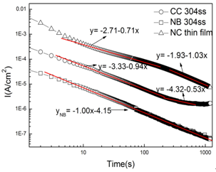 Figure 5. Double-log plots of current-time for CC 304ss, BN304ss and NC thin film in 0.05 M H2SO4 +