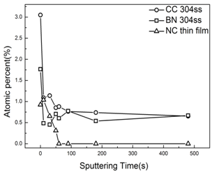 Figure 6. Distribution of chloride ion in passive layers on CC 304ss, BN 304ss and NC thin film