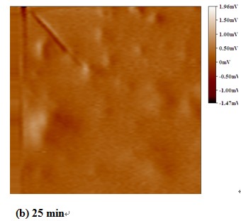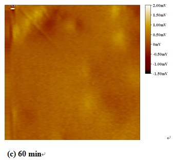 图1. NS-304SS样品浸泡在10%FeCl3溶液中不同时间的微区电位分布图: (a) 20min, (b) 25min, (c) 60min.扫描范围:4000μm×4000μm.
