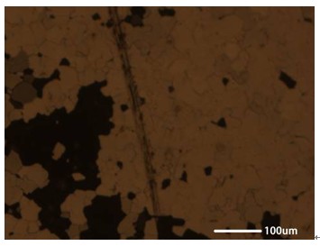 图3显示的是NS-304SS与S-304SS样品在微区电位分布测试结束后局部腐蚀活性区域的光学图片。从图可知,两者的腐蚀形态存在明显的差异,前者(图3.a)存在明显的腐蚀坑,且腐蚀坑周围的电极表面较为完整,未出现晶间腐蚀。而后者(图3.b)则存在多个腐蚀点,且腐蚀区域存在彼此相连、相互耦合的现象,这与微区电位分布得到的结果是完全吻合的。图3.c是图3.b的局部放大图,从中可看出,在不锈钢表面的晶粒周边,均出现腐蚀,也进一步说明S-304SS样品发生的是典型的晶间腐蚀。