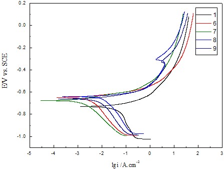 (c) 动电位极化曲线:组分1,6-9 (d)Nyquist图:组分1,6-9