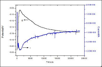 随着N80钢的电位噪声逐渐趋于稳定,表面的钝化过程基本趋于结束。在盛有NaHCO3溶液中加入4mol/L的NaCl,使Cl-离子浓度保持在0.5mol/L。