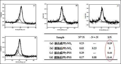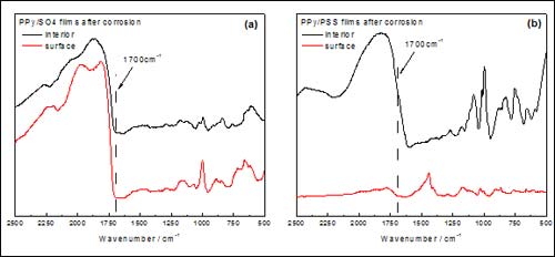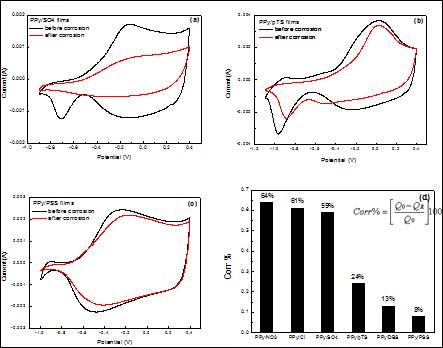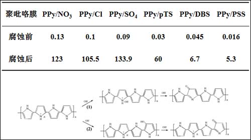 聚吡咯膜中掺杂阴离子的尺寸越大,阴离子交换性越差,亲核的OH-难以与聚吡咯膜中的掺杂阴离子发生交换,聚吡咯的耐蚀性越好。
