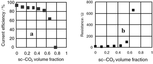 sc-CO2 volume fraction vs. Current efficiency & Resistance