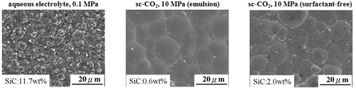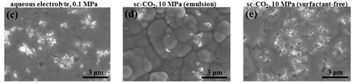 The surfactant addition in sc-CO2 containing electrolyte play an important role on the surface appearance of the deposits. When electrodeposition was performed in the emulsified sc-CO2 electrolyte, a flat and almost pinhole-free surface was observed.