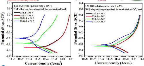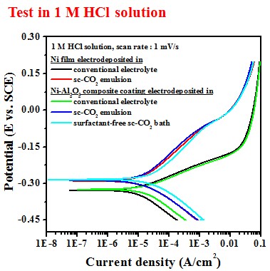 In 1 M HCl solution, the Ni film deposited in sc-CO2 bath had a lower anodic current density and a higher polarization resistance, which is mainly attributed to the crystallographical orientation.
