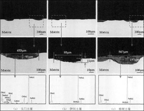 X80钢在三种土壤介质中,分别经60d室内埋设并去除表面腐蚀产物后的截面形貌及其局部放大图的背散射电子像和腐蚀产物能谱分析结果
