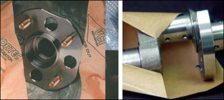 (8)纸布载体法:本法是将气相缓蚀剂涂或浸于载体(纸、布)等上,经干燥后,再分置于待包装物的四周,也可直接用纸包装制作,再置于密封包装(纸盒、木箱、塑料袋等)内。目前国内生产的各种牌号的气相防锈纸是用这种方法制成的。国外如美国歌德公司,国内如武汉防锈纸厂生产的 W41、W25、W12等气相防锈纸,属于纸布载体法制造的。气相防锈纸应用范围最广,例如用于汽车、飞机的发动机及零部件和刀具、量具、精密仪器、滚珠轴承、机床零件,以及各种武器军械的防锈包装等(目前用得最多的是牛皮纸,这是因为牛皮纸有一定强度,腐蚀低且价格低廉的缘故)。