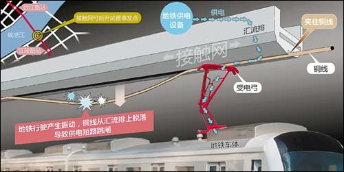 汇流排和电缆--地铁列车车背上有一个弓状物,叫做“受电弓”;地铁隧道顶部有一排供电设备,就像一道管线,贯穿整个地铁隧道,叫做“汇流排”,汇流排是铝合金材质,在它的中间顶端位置,夹着一根铜质电缆。这整个供电系统,就叫做接触网。列车运行时,受电弓与铜质电缆接触,电就源源不断地从汇流排传导到电缆上,再由电缆传导至受电弓,进入地铁驱动电机后,再通过铁轨返回到供电站,形成一个回路。
