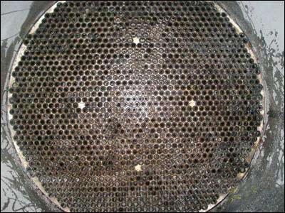 1990年2月4日发电机组进行第二次大修,对4号汽轮机的三个凝汽器空抽区进行抽管检查,位置均在空抽区,以自下向上数第十七排为中心,向上下抽管。发现在上下五排范围内均有不同程度的氨腐蚀,铜管减薄,外表呈黄铜色。特别是第十七排附近尤为严重,在放置铜管的隔板位置上,铜管上有很深的环形腐蚀沟,附近也呈黄铜色。垢样分析含氧化铜量,汽包内旋风分离器上和汽包内加药管上均为2%。由此可见,铜管的氨蚀己相当严重,有些局部明显减薄,已到了非解决不可的地步。