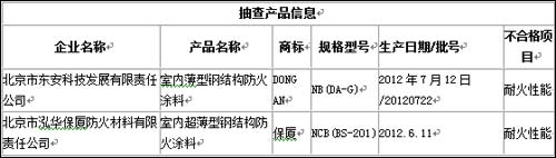 抽查结果表明,北京市防火门、可燃气体报警控制器、饰面型防火涂料、汽车防盗报警系统和防盗安全门产品质量良好,抽查产品均检验合格。抽查发现部分批次钢结构防火涂料产品的耐火性能项目不符合国家标准。