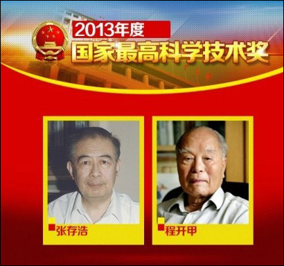 【2013年国家最高科学技术奖得主:张存浩、程开甲】2014年1月10日上午,国家科学技术奖励大会在人民大礼堂举行。每年不超过两名的国家最高科技奖,是中国科技界的最高荣誉,奖金为500万元。2013年国家最高科学技术奖由物理化学家张存浩和物理学家程开甲获得。