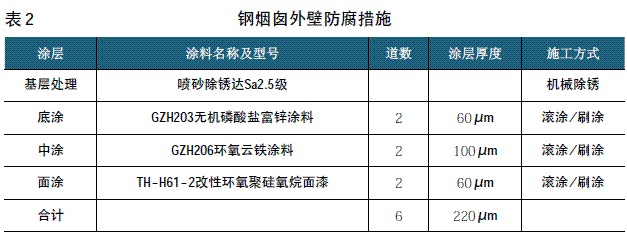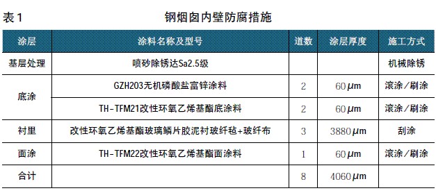 (2)烟囱内壁防腐涂料、耐蚀树脂的选择要求。烟囱内壁受烟气中腐蚀性介质的腐蚀较外壁严重,须选择具有优异的耐化学介质性、耐久性、抗老化性、抗冲性能、抗渗性能,耐磨、耐油、耐有机溶剂、耐水性能优良,抗潮湿性、耐温性能好的涂料;选择耐化学腐蚀性强、耐磨、耐冲击力强、抗老化、抗霉菌、防开裂性能好的耐蚀树脂。