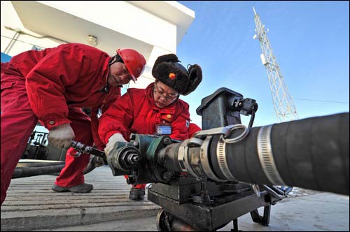 图为2月2日,员工在利用加注分配器加注缓蚀剂。吕殿杰 摄