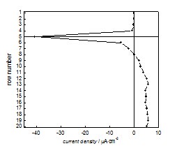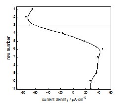 下图分别为小、大电极在整个实验阶段各单行的平均电流密度。自水线向下,阳极电流随深度变化呈现一定规律。小电极为由水线向下,阳极电流先增大至第6行,后逐渐减小。大电极为由水线向下,阳极电流先增大至第13行,后略有减小。水线下腐蚀速率极值距水线的距离分别为7.8mm和17cm,位于各自腐蚀区(水线以下成为腐蚀区)的4/9和9/16处。据此规律,我们认为水线下阳极电流分布跟水线下电极尺寸有关,浸入水下的电极越长,阳极电流极值的位置距离液面越远,但接近于腐蚀区的1/2处。