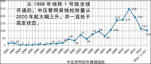 广州市地铁开通之后,邻近的地下燃气管、输油管腐蚀加速,机场下面的油料管道受影响,市区燃气管抢修量十年增加十倍。市安监局表示,这是他们遇到的“新情况”:地铁运行不可避免产生的杂散电流,对金属管道造成腐蚀。据不完全统计,全市光是燃气管道,就有上百公里与地铁并行,其中近85公里位于市区。如何降低地铁杂散电流的影响,成为政府、地铁、油气管道企业的新课题。