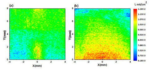 铝合金WOL试样浸泡不同时间后裂尖电流密度分布(a)0.5h,(b)24h