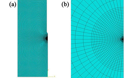 二维WOL试样有限元模型:(a)整体网格,(b)裂纹尖端附近细化网格