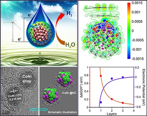 1月12日,中科院大连化物所催化基础国家重点实验室邓德会副研究员与包信和院士带领的研究团队在长期深入研究纳米碳材料催化的基础上,通过创新二维纳米碳材料(类石墨烯材料)的制备策略和合成方法,成功实现了均一的超薄石墨烯壳层(一般为1-3碳层)对3d过渡金属纳米粒子的包裹和封装。理论模拟和实验研究表明,在催化反应过程中,活性金属纳米粒子催化剂在纳米碳空腔中的封装阻断了其与苛刻反应环境(如酸性、碱性和强氧化性等)的直接接触,有效地延缓和阻止了催化剂的失活,同时,被包裹的纳米金属的活性价电子通过与类石墨烯碳层的相互作用“穿透(penetration)”到外表面,实现了高效催化反应。基于这一原理制备得到的石墨烯碳层封装的纳米钴-镍催化剂应用于强酸性条件下电解水制氢反应(HER),表现出了优异的催化活性和稳定性,在电流密度为10 mA/cm2 条件下,电解水阴极过电位仅为142 mV,性能接近于通常采用的40%Pt/C催化剂,相关结果于近日在《德国应用化学》(Angew. Chem. Int. Ed., 2015, DOI: 10.1002/anie.201409524)在线发表,并被该期刊选为“热点文章(Hot Paper)”。