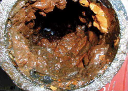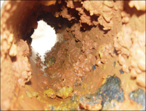 金属管道、配件、水箱和水塔等输配水设施本身含有杂质,金属与杂质之间存在着不同的电极电位,这样,在水的作用下会形成无数微腐蚀原电池,由于化学和电化学作用会对管道内壁造成较严重腐蚀,产生大量铁、锰、铅、锌等金属锈蚀物。研究表明,对于未作防腐处理的金属管道,当年限超过5~10年时,污垢就会达到恶化水质的程度,对于防腐处理较低的金属管道,3~5年就开始出现腐蚀现象,管道使用年限越长,腐蚀越严重,水质状况越差。腐蚀物和水垢物是管网中形成的新的污染源,沉积物是潜在污染源。