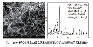 盐雾试验结果表明Zn-Al-Mg-RE高速电弧喷涂层具有最好的耐蚀性能,耐蚀寿命为Zn和Al涂层的4倍以上。经过进一步电化学试验手段分析认为:在腐蚀环境中,Al涂层容易发生点蚀,腐蚀产物无自封闭作用;Zn涂层的腐蚀产物易溶于水,表现出微弱的自封闭效果;Zn-15Al涂层的腐蚀产物对涂层中的孔隙能产生一定的自封闭作用,但不彻底;加入Mg后的Zn-Al-Mg涂层在腐蚀后形成较致密的腐蚀产物,自封闭效果较为明显,但不稳定;加入RE元素后,改善了涂层组织的均匀性,降低了涂层的孔隙率,提高了腐蚀产物层的稳定性,其自封闭作用明显,从而进一步提高涂层的耐蚀性能,Zn-Al-Mg-RE涂层在腐蚀过程中表现出明显且稳定的自封闭现象。
