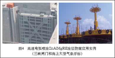 提出了Zn-Al-Mg-RE涂层的“自封闭”机理。该涂层在腐蚀动态过程中形成了纳米腐蚀产物,随着腐蚀反应的进行,生成了一系列Zn的碱式盐类、Mg的氢氧化物及Mg与Al形成的尖晶石氧化物的水合物等腐蚀产物(如图3所示),这些腐蚀产物不但能够在涂层表面形成钝化膜,还能够有效地堵塞涂层中的孔隙,切断腐蚀介质的快速通道,从而提高涂层的耐蚀性。该涂层耐蚀性能为传统Al涂层的2-3倍,有效解决了“点蚀”难题,可使海洋工程设施的防护寿命由原来的3-5年提高到10-15年以上,并成功应用到了大型水坝闸门、海洋气象浮标、民用船舶甲板等钢结构件上(应用实例见图4所示),防护效果显著。