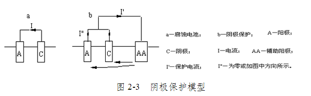 上图a为未加阴极保护之前金属本身的腐蚀的电池模型;b为加阴极保护以后保护电池的电路及原来腐蚀电池的变化,所加的外电流I‘的方向是使被保护金属作为阴极。