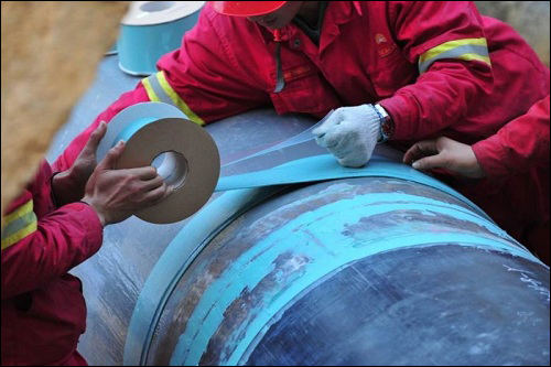 2、焊好一道口后立即补口方式。采用SAKP型手动补口机,每焊一道补口一道口。最长补口长度为12米。