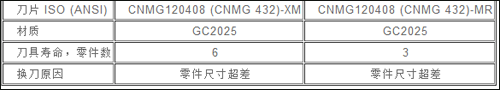 刀片 ISO (ANSI)CNMG120408 (CNMG 432)-XMCNMG120408 (CNMG 432)-MR材质GC2025GC2025刀具寿命,零件数63换刀原因零件尺寸超差零件尺寸超差与竞争对手槽型相比,刀具寿命提升了100%。