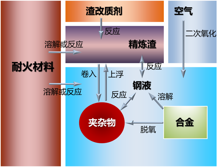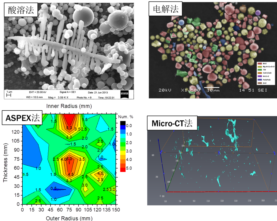 钢铁是使用最为广泛的金属材料。由于其生产工艺所致,钢中不可避免地存在非金属夹杂物。这些夹杂物的尺寸从纳米级到毫米级,种类包含氧化物、硫化物、氮化物等,有些是脱氧产物,有些是凝固和冷却过程析出的。大部分夹杂物,尤其是大尺寸夹杂物对钢材的性能有害,但是细小夹杂物和一些析出物却可以起到细化晶粒、强化性能的作用。对钢中非金属夹杂物的种类、尺寸、数量、形貌的控制是提高钢铁材料使用性能的关键因素之一。