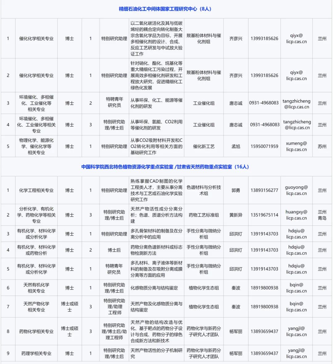 研究所简介 中国科学院兰州化学物理研究所(以下简称兰州化物所)建成于1958年,定位于“资源与能源化学和新材料西部创新高地”,主要开展资源与能源、新材料、生态与健康等领域基础研究、应用研究和战略高技术研究工作。 兰州化物所围绕航空航天、高端装备制造等重点需求,在润滑与密封防护材料领域建设有固体润滑国家重点实验室和兰州润滑材料与技术创新中心两个国家级创新平台,以及中科院材料磨损与防护重点实验室和中科院高端装备油脂工程实验室两个中科院院级平台。围绕国家“碳达峰碳中和”战略,在能源与催化化学领域拥有羰基合成与选择氧化国家重点实验室和精细石油化工中间体国家工程研究中心两个国家级创新平台,并设有清洁能源化学与材料实验室。围绕西部特色植物、矿物资源和生态环境材料与工程,建设有特色药用植物资源高值化利用国家地方联合工程研究中心(同时为中科院西北特色植物资源化学重点实验室、甘肃省天然药物重点实验室)和甘肃省黏土矿物应用研究重点实验室。 建所以来,获得科技奖励240余项,其中国家级奖励41项(含第一完成单位获国家科技进步特等奖1项)、省部级一等奖39项、摩擦学领域国际最高奖1项,为我国石油化工及战略高技术发展作出了重大贡献,同时在催化、润滑和摩擦学理论以及分离分析科学与技术等方面产出了一系列创造性的成果。培养造就了若干享誉国内外的科学家及一大批高素质研究和技术人才,包括中国科学院院士1人,中国工程院院士1人,发展中国家科学院院士1人,国际摩擦学金奖获得者1人,何梁何利奖获得者4人,全国创新争先奖获得者3人,“国家杰出青年基金”获得者7人,“国家卓越青年基金”获得者2人,“国家优秀青年基金”获得者6人。目前,在职职工中正高级专业技术人员121人、副高级专业技术人员177人。兰州化物所现设有化学和材料科学与工程两个一级学科博士学位培养点,化学一级学科博士后流动站。 建所以来,获得科技奖励240余项,其中国家级奖励41项(含第一完成单位获国家科技进步特等奖1项)、省部级一等奖39项、摩擦学领域国际最高奖1项,为我国石油化工及战略高技术发展做出了重大贡献,同时在催化、润滑和摩擦学理论以及分离分析科学与技术等方面做出了一系列创造性的成果。培养造就了若干享誉国内外的科学家及一大批高素质研究和技术人才,包括中国科学院院士1人,中国工程院院士1人,发展中国家科学院院士1人,国际摩擦学金奖获得者1人,何梁何利奖获得者4人,全国创新争先奖获得者3人,“国家杰出青年基金”获得者7人,国防“卓越青年基金”获得者2人,“国家优秀青年基金”获得者6人。目前,在职职工中正高级专业技术人员121人、副高级专业技术人员177人。兰州化物所现设有化学和材料科学与工程两个一级学科博士学位培养点,化学一级学科博士后流动站。 根据研究所工作需要,面向社会公开招聘优秀人才,诚邀海内外有志之士加入,共创辉煌。 (五)研究所根据不同的人才计划提供具有竞争力的科研专项经费和薪酬待遇;提供住房补贴、一次性安家费等。 应聘者直接联系用人课题组(人才团队)(详见附件1),同时将应聘材料发送至以下邮箱。中国科学院兰州化学物理研究所2023年人才招聘启事