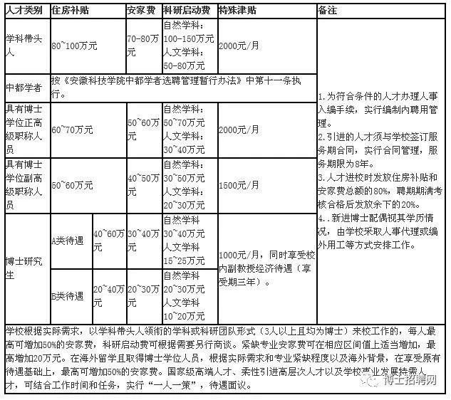 安徽科技学院创办于1950年,1965年开始举办本科教育,2012年开始独立培养研究生,2021年成为硕士学位授予单位,现为国家“卓越工程师教育培养计划”项目建设高校、全国重点建设职教师资培养培训基地和“地方应用型高水平大学”项目建设高校。学校现有凤阳校区和蚌埠龙湖校区,拥有14个二级学院,50个本科招生专业,涵盖农、工、理、管、经、文、法、医等学科门类,形成了以优势农科和新兴工科为重点,多学科相互支撑、协调发展的应用型学科专业体系。现有国家级一流本科专业建设点1个、综合改革试点专业1个、特色专业2个、卓越工程师教育培养计划专业4个、复合应用型卓越农林人才教育培养计划改革试点专业3个,承担国家新工科、新农科研究与实践项目4项。拥有省级重点学科6个、一流本科专业建设点14个、一流(品牌)专业3个、综合改革试点专业16个、特色专业11个,2021年,财务管理专业纳入本科一批次招生,种子科学与工程专业作为国家紧缺专业纳入提前批次招生。建校70年来,学校已累计为国家和地方经济社会发展输送了10万余名优秀毕业生。学科带头人、中都学者、具有博士学位正高级职称人员、具有博士学位副高级职称人员、博士研究生。引进对象除符合招聘岗位条件外,还必须符合以下基本条件:3、善于团结协作,责任心强,深受同行专家认可和赞誉。学科带头人、中都学者特聘教授50周岁以下,青年中都学者40周岁以下;具有博士学位正高级职称人员50周岁以下;具有博士学位副高级职称人员45周岁以下;博士研究生40周岁以下。特殊需求人才年龄可适当放宽。近5年科研业绩达到安徽省规定的三类以上人才标准。对我校急需引进的紧缺人才,科研业绩可适当放宽。对于不能全职来校工作的,可采用柔性方式引进。按《安徽科技学院中都学者选聘管理暂行办法》第八条执行。近5年取得显著的研究成果,主持国家级科研课题1项以上或省部级科研课题2项以上,且作为第一作者或通讯作者在自然科学学科SCI收录刊物上发表论文累计影响因子达到15.0以上(其中机械、电气、计算机等学科可以根据具体情况,以EI收录期刊论文、本学科国内顶级期刊、一流学报或其他相当业绩等代替部分SCI论文);人文社会学科在CSSCI来源刊物上发表论文5篇以上。近5年取得显著的研究成果,主持省部级科研课题1项以上,且作为第一作者或通讯作者在自然科学学科SCI收录刊物上发表论文累计影响因子达到12.0以上(其中机械、电气、计算机等学科可以根据具体情况,以EI收录期刊论文、本学科国内顶级期刊、一流学报或其他相当业绩等代替部分SCI论文);人文社会学科在CSSCI来源刊物上发表论文4篇以上。A类业绩:具有突出的科研能力,并取得显著的研究成果。作为第一作者,自然科学学科在SCI收录刊物上发表论文3篇以上或单篇影响因子6.0以上;人文社会学科在CSSCI来源刊物上发表论文3篇以上。B类业绩:具有较高的科研能力,并取得较显著的研究成果。作为第一作者,自然科学学科在SCI收录刊物上发表论文2篇以上或单篇影响因子4.0以上或在EI(JA)收录刊物上发表论文3篇以上;人文社会学科在CSSCI来源刊物上发表论文2篇以上。具备高校教师应有的基本素质和教育教学能力,经学校考核达到良好以上等次。1、紧缺专业:马克思主义理论、应用经济学、外国语言文学、法学、数学、机械工程、光学工程、电气工程、电子科学与技术、信息与通信工程、控制科学与工程、计算机科学与技术、建筑学类、食品科学与工程、药学、中药学、管理科学与工程、工商管理、地理信息科学等一级学科范围内的专业。