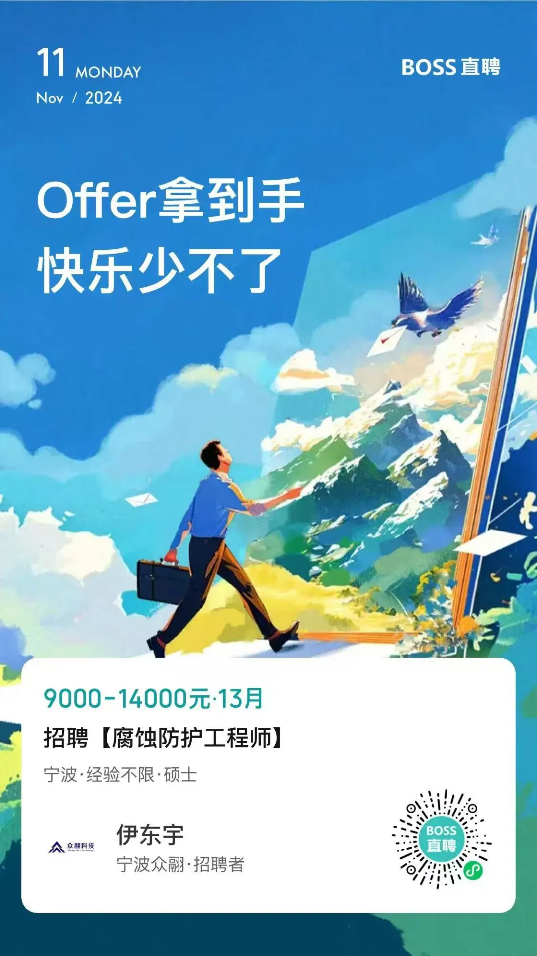 招聘防腐蚀工程师月薪9000-14000元.13月