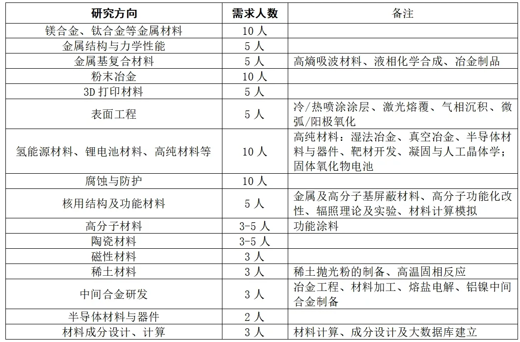今日招聘单位: 一、西安稀有金属材料研究院有限公司招聘简章 HOT! 一、稀有院简介: 西安稀有金属材料研究院有限公司(以下简称“稀有院”)于2017年12月21日注册成立。稀有院是“国家先进稀有金属材料技术创新中心”运营主体单位,拥有“陕西省稀有金属材料创新中心”及“陕西省先进稀有金属材料共性技术研发平台”双省级创新平台,是一个全新模式、全新体制的高层次、高水平科技创新平台。稀有院由西北有色金属研究院发起,包括西安交通大学、西北工业大学、东北大学等高校共同合作建设。西北有色金属研究院名誉院长周廉院士出任首任院长,多名院士、长江学者和科技界杰出青年学者共同组成专家团队。稀有院研究生学历员工超过97.9%,其中博士研究生为66.4%。 稀有院为响应“建设世界科技强国,打造一批科研院所,培育一批创新型领军企业”等国家创新体系建设要求,组建了核用材料、新能源材料、稀有金属功能材料、电容器材料及传感器、粉体材料及制品、金属基复合材料、高熵合金及非晶材料、表面技术及涂层材料等团队,重点为我国核工程、航空航天及海洋工程研发急需高端关键材料,为解决国家战略领域和产业发展关键瓶颈问题提供支撑。 稀有院重点建设稀有金属材料研发、中试验证、公共测试和成果转化平台,以及人才培养与国际交流合作基地。稀有院已取得ISO9001:2015质量管理体系认证、中核集团合格供应商认证,是国家高新技术企业,获批建立了国家博士后科研工作站、陕西省和西安市博士后创新基地、西安市院士工作站等人才创新平台,通过了陕西省新型研发机构、国家知识产权优势企业、陕西省瞪羚企业、西安市瞪羚企业、西安市核用稀有金属材料工程技术研究中心、西安市核用先进稀有金属材料制备工程研究中心、西安市企业技术中心、秦创原两链融合“促进器”示范平台等认定。 二、需求岗位: 1、岗位名称:研发工程师 2、聘任要求: 1)专业要求:材料学、材料加工、材料物理化学、复合材料、粉末冶金、核用材料、氢能源、锂电池等专业; 2)研究方向与需求人数: 3)学历要求:博士研究生(或优秀硕士研究生符合岗位要求者); 4)其他要求:第一作者发表SCI论文总影响因子IF不低于6。 3、福利待遇: 1)年收入:博士:28-31万/年;硕士:16—19万/年; 2)结合业绩发放年终奖、科研奖、专利奖、项目奖等; 3)为员工缴纳七险二金; 4)享有节日福利、住房补助、交通补助、用餐补助、采暖补贴、高温补贴、企业专项医疗补助、年休假、职工年度体检等福利; 5)博士安家费: 税后35万; 6)相关股权激励。 4.职业发展: 1)为研发技术人员提供不低于40万的科研启动经费; 2)提供完善的职业发展体系(从助理研究员至首席研究员的发展通道)。 三、其他 应聘者请将个人简历(命名方式:募格科聘-硕/博士-毕业院校-专业-姓名),发送至邮箱:hr@rmmi.cn,联系人:李女士,联系电话:029-86231074。 二、云南锡业新材料有限公司 注:同时将简历抄送至1584504047@qq.com 邮件标题:募格科聘-应聘岗位-姓名 三、迪文科技2025届校招正式启动 注:同时将简历抄送至1584504047@qq.com 邮件标题:募格科聘-应聘岗位-姓名